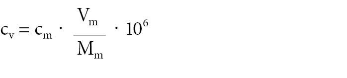 Um die Volumenkonzentration in die Massenkonzentration umzurechnen, werden die molare Masse und das molare Volumen benötigt. Das molare Volumen kann dazu auch für reale Gase annäherungsweise mit dem molaren Volumen idealer Gase bei Normalbedingungen (0 °C, 1 013 mbar) von 22,41 Liter bzw. rund 24,1 Liter bei 20 °C gleichgesetzt werden. Die Umrechnung erfolgt bei einer Temperatur von 20 °C und Normaldruck (1013 mbar) nach der Formel: