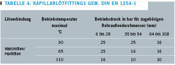 Angaben aus DIN EN 1254 sind in Tabelle 4 zusammengefasst. Die Verwendbarkeit von Lötfittings bei höheren Innendrücken oder höheren Temperaturen muss unter Angabe des durchfließenden Mediums, der Min./Max.-Temperaturen und des Druckes erfragt und vom jeweiligen Fittinghersteller freigegeben werden.