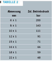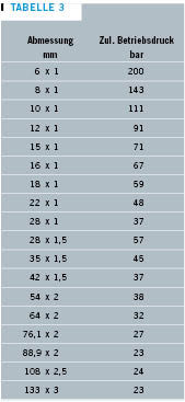 Tabelle 3 fasst die zulässigen Drücke für Rohre in gerader Ausfertigung, Lieferlänge 5 m, zusammen. Auch hier sind bei abweichenden Abmessungen Hersteller oder Händler anzufragen.