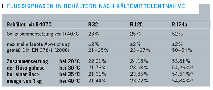 In unserer Veröffentlichung wurde Berechnungsmethode a) herangezogen. Wird der Menüpunkt Flüssigbefüllung aus Behältern zur Berechnung verwendet, ergeben sich andere Werte für die Zusammensetzung von Dampf und Flüssigkeit der Restfüllmenge. Diese Werte sind stark temperaturabhängig. Wird als Temperatur bei der Entnahme 20 °C angenommen, ergeben sich kleinere Abweichungen von der Sollzusammensetzung als beispielsweise bei 40 °C. Die nachfolgende Tabelle zeigt die Zusammensetzung der Restmenge im Kältemittelbehälter für folgende Bedingungen: