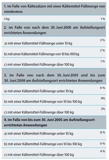 (1) Wer ortsfeste Einrichtungen im Sinne des Artikels 4 Absatz 2 Buchstabe a bis d der Verordnung (EU) Nr. 517/2014 betreibt, hat sicherzustellen, dass zusätzlich zu den Anforderungen des Artikels 3 Absatz 1 und 2 der Verordnung (EU) Nr. 517/2014 der spezifische Kältemittelverlust der Einrichtung während des Normalbetriebs die folgenden Grenzwerte nicht überschreitet: