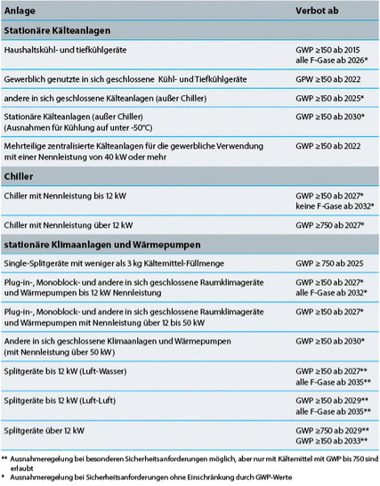 Nachfolgend eine knappe tabellarische Zusammenfassung der Inverkehrbringensverbote für H-FKW-Kältemittel mit einem GWP unter 2500: