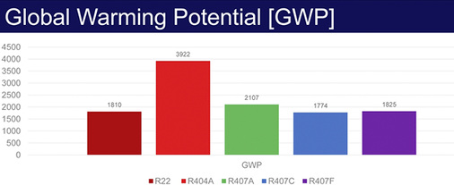 Mit der EU-Verordnung wird das Inverkehrbringen und die Verwendung von Kältemitteln mit einem GWP-Wert 2 500 (u. a. R 404 A, R 507, R 422 A, R 422 D) sukzessive verboten. Als Alternativen kommen R 407 A mit einem GWP von 2 107 und R 407 F mit einem GWP von 1 824 in Frage. Auch neue Kältemittel und -gemische auf HFO-Basis mit niedrigem GWP, brennbare Kältemittel und R 744 (CO2) werden an Bedeutung gewinnen.