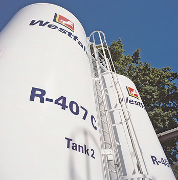 Das natürliche Kältemittel R 744 (CO2) ist nicht brennbar und mit einem GWP-Wert von 1 ausgestattet. Für die qualitativen Anforderungen an Kältemittel existieren einschlägige Normen. Darin fehlt allerdings die Anforderung an R 744. Deshalb hat die Westfalen Gruppe für den Vertrieb dieses Kältemittels auf der Informationsgrundlage von Verdichter- und Komponentenherstellern, von Anlagenbauern und Universitäten eigene Qualitätskriterien festgelegt. Vor allem der Anteil an Feuchtigkeit (Wasser/H2O) muss, um Hydratbildung und Korrosion zu verhindern, sehr gering gehalten werden. Aufgrund des sehr hohen Tripelpunktes von CO2 ist die Entnahme aus den Flaschen zum Befüllen der Anlage in gasförmiger und flüssiger Form notwendig. Daher hat die Westfalen Gruppe die T33-Flasche mit Doppelanschlussventil eingeführt. Da vor allem für den Service ein kleinerer Flaschentyp notwendig ist, wurde auch die 13,4-Liter-Flasche in Aluminiumausführungund mit Doppelanschlussventil ausgestattet.