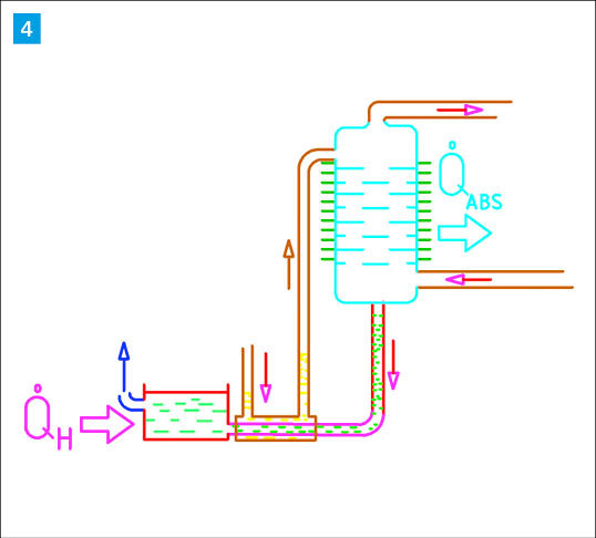 Die zirkulierende Strömung funktioniert durch die Wirkung der Schwerkraft, da das Gemisch aus H₂ und NH3 schwerer ist als (nahezu) reiner H₂. Das absorbierte Ammoniak strömt nun als Bestandteil der reichen Lösung zum Kocher. (Bild 4)