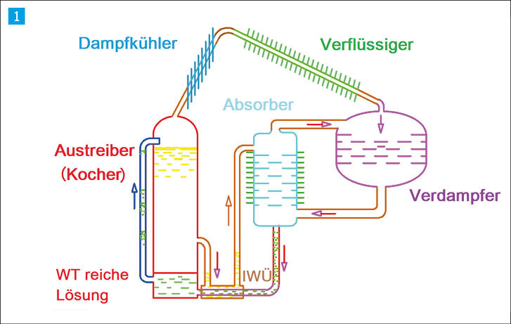 Im Absorber wird das Ammoniak durch die arme Lösung aufgesaugt. Dadurch entsteht die reiche Lösung unter Wärmeabgabe.