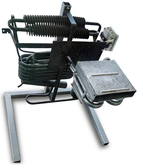 Anschließend kondensiert das NH3 zu nahezu 100 % im Verflüssiger. Durch die Strömung des Ammoniaks wird der Wasserstoff komplett aus Dampfkühler und Verflüssiger (Hochdruckseite)₃ in Verdampfer und Absorber (Niederdruckseite)₄ geschoben, wo er während des Betriebes bleibt. Es herrscht in der ganzen Anlage der gleiche (Gesamt-) Druck. Das verflüssigte Ammoniak tritt darauf in den Verdampfer, der neben dem Absorber, jedoch etwas höher als dieser, angeordnet ist. (Bild 3)