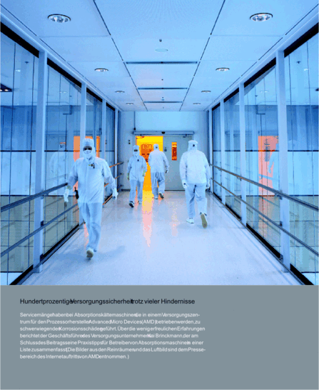 Die zuvor genannten Bedingungen hinsichtlich der Verfügbarkeit der Maschinen gelten naturgemäß auch und gerade für die installierten Kältemaschinen. Um die Versorgung sicherzustellen, wurden mit den Lieferanten der Anlagen Serviceverträge abgeschlossen. Allerdings ließ die Güte der angebotenen Dienstleistungen sehr zu wünschen übrig. Die mit der ersten Lieferung von fünf japanischen Absorptionskältemaschinen im Jahre 1998 mitgelieferte technische Dokumentation war unbrauchbar und auch die Fachkenntnis der für den Service der Maschinen zuständigen Techniker der Fachfirma war völlig unzureichend. Bereits nach 18 Monaten Betriebszeit setzte an den vier zweistufigen Maschinen ein starker Leistungsabfall ein, der zunächst nicht zu erklären war. Nach langwierigen und hilflosen Erklärungsversuchen durch die Fachfirma wurde schließlich festgestellt, dass der innere Korrosionsschutz durch den Korrosionsinhibitor Li 2 CrO 4 nicht mehr existierte und die Maschine durch Korrosionsangriff und Verschlammung mit Korrosionsprodukten nachhaltig geschädigt war. Es hatte weder in der Dokumentation noch durch die Fachfirma Hinweise darauf gegeben, dass der Korrosionsinhibitor mindestens quartalsweise überprüft und ggf. nachdosiert werden muss. Kurz nachdem Gewährleistungsansprüche geltend gemacht wurden, ging die Servicefirma in die Insolvenz.