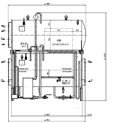 Die Entscheidung der Stadtwerke Gießen zugunsten der Baelz AKA fiel aufgrund ihrer relativ geringen Größe (Bild 2) und verschiedener technischer Vorzüge dieser Maschine (Tabellen 2 und 3). So kann sie durch besonders niedrige Heißwassertemperaturen angetrieben werden. Die Stadtwerke brauchten eine neue Kühlanlage für ein Bürogebäude, zwei Rechenzentren und eine Telefonanlage Die bisherige Kühlung mit Trinkwasser über Plattenwärmeübertrager reichte nicht mehr aus. Zu kühlen waren insgesamt 68 kW. Um auch für Spitzenlast ausreichend Kapazität zu haben, fiel die Wahl auf eine Hummel, die auch 75 bis 100 kW leisten kann. Es ist hier also noch mehr als ein Viertel der Leistungsfähigkeit als Reserve für Spitzenlasten vorhanden. Interessant war außer dem niedrigen Leistungsbereich der sehr gute COP-Faktor von 0,73, den keine der anderen Anlagen erreicht (Teillast bei ca. 30 Prozent). Die Wärme, die von BHKWs erzeugt wird und mit der die AKA betrieben wird, kommt aus dem Fernwärmenetz. Der Heißwasserein- bzw. -austritt liegt normalerweise bei 80 °C/60 °C. Ein trockener Rückkühler kühlt im Sommer die Restwärme der AKA und im Winter nach Abschaltung der AKA direkt die entsprechenden Räume. Im Winter kühlt die Außenluft einen Plattenwärmeübertrager. Ein weiterer wichtiger Punkt, der für die Bälz AKA spricht, ist ihre schnelle Reaktionszeit. Bei plötzlichem Temperaturanstieg ist die Anlage innerhalb von weniger als 10 min von 25 auf 100 Prozent Leistung. So kann eine sehr rasch sich erhöhende Raumtemperatur, wenn beispielsweise die Sonne auf die Südfenster brennt, in kürzester Zeit wieder heruntergekühlt werden.