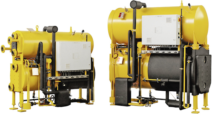 Entstanden ist nun eine kompakte Anlage mit vergleichsweise geringem Gewicht (Tabelle 1), die keine Schwierigkeiten beim Transport macht. Die wesentlich geringere Menge an Kälte- und Lösungsmittel im Vergleich zu anderen Geräten spart außer Gewicht auch Kosten. Angeboten wird die Anlage in zwei unterschiedlichen Größen, genannt Biene“ und Hummel“ (Bild 1). Die Namen beziehen sich zum einen auf die Farbgebung und zum anderen auf die unterschiedliche Größe. Teilmodulare Bauweise erlaubt dank der Neuentwicklung der Absorptionskältemaschinen mit 50 bzw. 160 kW einen Leistungsbereich von ca. 50 bis 320 kW. Das Konzept von Biene und Hummel auf eine 500-kW-Anlage (Hornisse) zu erweitern, wird zurzeit geprüft.
