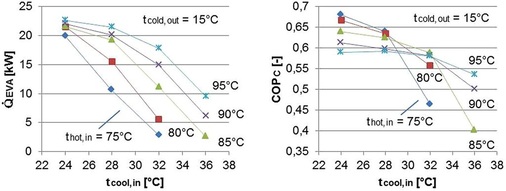 Der Einfluss der Kaltwassertemperatur im Verdampfer (t cold ) ist nicht explizit dargestellt. Bei den Messungen zeigt sich jedenfalls der zu erwartende Verlauf, wonach Kälteleistung und Leistungszahl mit sinkender Kaltwassertemperatur aufgrund des tieferen Niederdruckniveaus im Verdampfer (und Absorber) abnehmen.