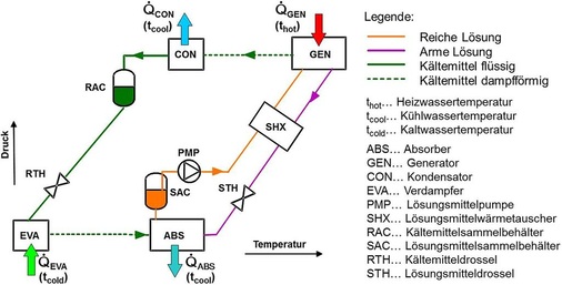 Für die Simulation des stationären Be-triebsverhaltens der Absorptionskälteanlage wurde ein Modell basierend auf den Stoff-, Massen- und Energiebilanzen der einzelnen Komponenten in EES (Engineering Equation Solver V 8.659) erstellt. Dieses wurde derart angelegt, dass bei Vorgabe der Eintrittstemperaturen des Heiz- und Kühlwassers bzw. der Austrittstemperatur des Kaltwassers und den drei zugehörigen Volumenströmen die resultierenden Leistungen der Wärmeübertrager und die Zustände am Ein- und Austritt den einzelnen Anlagenkomponenten berechnet werden.