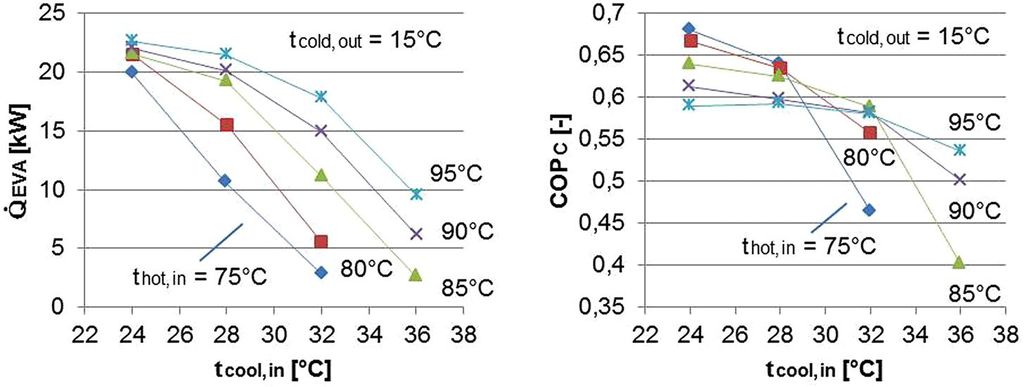 Die Leistungszahl des Prozesses für Kälteanwendung (COP C ) sinkt tendenziell mit zunehmender Kühlwassertemperatur, bei Kälteleistungen kleiner 10 kW und bei steigender Generatortemperatur wegen der nicht vorhandenen Rektifikation. Der aus dem Generator strömende Kältemitteldampf weist dadurch einen höheren Wasseranteil auf, welcher nachfolgend im Kondensator verflüssigt wird, aber im Verdampfer zum Großteil nicht wieder verdampft werden kann.