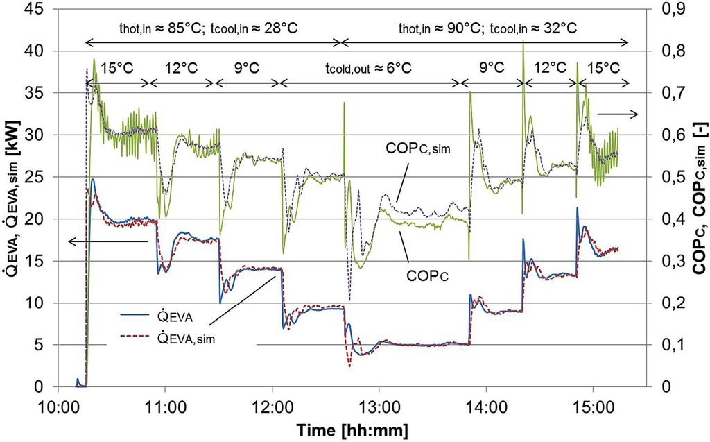 Die Ergebnisse des erweiterten Simulationsmodelles sind in Bild 5 dargestellt. Es werden die dynamisch berechnete Kälteleistung und die Leistungszahl innerhalb einer Messperiode verglichen. Die Kaltwasseraustrittstemperatur wurde in 3-K-Schritten verändert, von 15 °C am Beginn auf 6 °C um 12:05 Uhr und rückwärts von 6 °C auf 15 °C um 14:50 Uhr. Die Generatoreintrittstemperatur und die Kühlwassereintrittstemperatur sind um 12:40 Uhr von 85 °C / 28 °C auf 90 °C / 32 °C erhöht worden. Die Temperaturdifferenzen zwischen Ein- und Austritt an den externen hydraulischen Strängen wurden annähernd konstant gehalten.