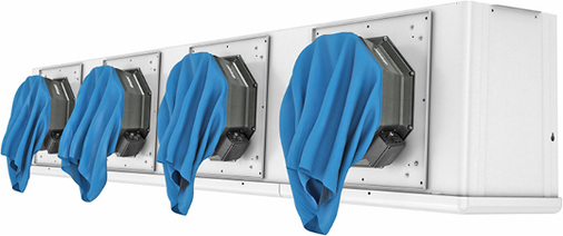 Als weiteren Vorteil hat der Anwender bei der EC-Ausführung die Wahl zwischen der konventionellen On/Off- bzw. Zweistufenregelung oder einer bedarfsgerechten Regelung über ein 0 – 10 V-Signal. Individuelle Anpassungen bei besonderen Kühlanforderungen werden dadurch erleichtert. Typische Beispiele hierfür sind Reifeprozesse bei der Lagerung von Käse, empfindlichem Obst oder Gemüse. Außerdem bleibt der hohe Wirkungsgrad der EC-Motoren auch im Teillastbetrieb erhalten. Eine bedarfsgerechte Regelung erschließt weitere Energieeinsparungen, z. B. können die Ventilatoren langsamer laufen, wenn nachts die Hallentore verschlossen sind und die Temperatur eher konstant bleibt.
