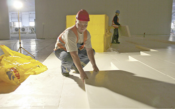 Das Besondere bei dem Bau der Kühlhalle: Die Ursa XPS N-VII-L Platten in 100 Millimeter Dicke wurden dreilagig unter der Bodenplatte verlegt. Gemäß der Allgemeinen bauaufsichtlichen Zulassung des Deutschen Institutes für Bautechnik (DIBt, Z-23.34-1493) können die XPS-Dämmplatten bis zu einer Gesamtdicke von 300 Millimetern unter lastabtragenden Bodenplatten von Gebäuden eingesetzt werden. Damit können sowohl die Anforderungen an die Wärmedämmung erdberührter Bauteile als auch an den Hochlastbereich erfüllt werden. Denn Ursa XPS D N-VII L zeichnet sich durch eine extrem hohe Druckspannung von 700 Kilopascal (CS(10\Y)700) und einem Kriechverhalten von 250 Kilopascal (CC(2/1,5/50)250) aus, so der Hersteller. Der Bemessungswert der Wärmeleitfähigkeit der 100 Millimeter starken Platten liegt bei 0,038 W/(mK). Das Material nimmt nahezu kein Wasser auf und kann damit selbst in drückendem Wasser verbaut werden. Zudem sind die Platten dimensionsstabil und wider-standsfähig gegen Frost-Tau-Wechsel.