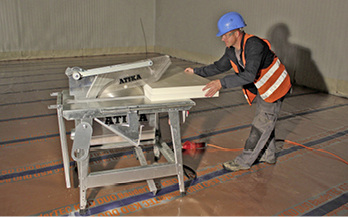 Aufgrund des allseitigen Stufenfalzes der Hartschaumplatten ist eine passgenaue, lückenlose und vor allem zügige Verlegung besonders einfach zu realisieren. Der Stufenfalz stellt auch die flächige Lastableitung von Platte zu Platte her. Die einzelnen Schichten werden versetzt verlegt, wobei die obere und die unterste Schicht parallel verlaufen. Die Platten lassen sich leicht und einfach zuschneiden und bearbeiten, sodass auch Stücke am Ende der einzelnen Dämmschichten im Wandanschlussbereich schnell zugesägt und eingesetzt werden konnten.