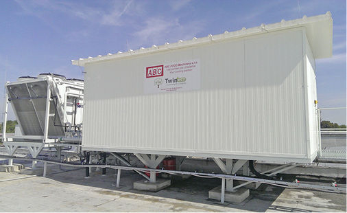Der externe Kälte-/Wärmeverbundsatz ist in einem kleinen Container auf dem Dach installiert. Das Kältemittel befindet sich nur innerhalb dieser Einhausung und die Wärmeübertragung auf die Kälte- bzw. Wärme-Wasser/Glykol-Kreisläufe geschieht über Plattenwärmeübertrager. Die nicht nutzbare Wärme führt ein direkt neben der Einhausung stehender Güntner V-SHAPE Vario, Typ GFD (250 kW Rückkühlleistung) über einen 30-prozentigen Monoethylenglykol-Kreislauf an die Umgebung ab und dient auf diese Weise als Verflüssiger.