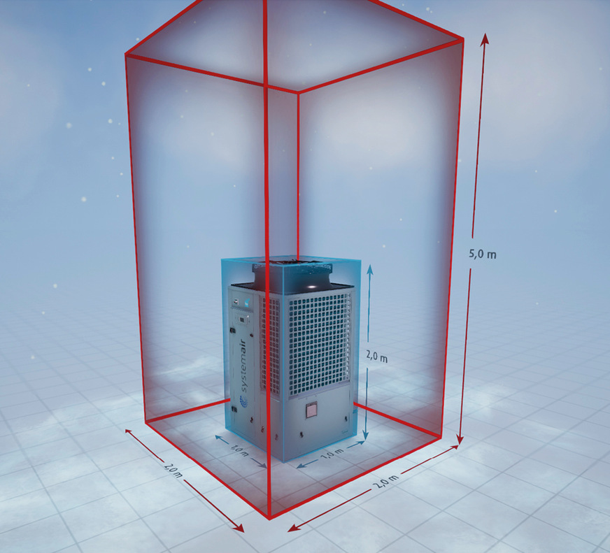 Als Schutzmaßnahme sollten Wärmepumpen und Kälteanlagen mit Propan in einem Abstand von mindestens zwei Metern zu Mauern aufgestellt werden. Dieser Abstand ist bei einer Anlagenkaskade auch zu weiteren Maschinen einzuhalten. Empfehlenswert ist außerdem, die Anlage nicht im Windschatten aufzustellen und nicht zu überdachen. So verdünnt sich im Leckagefall austretendes Propan durch natürliche Ventilation schneller in der Umgebungsluft.