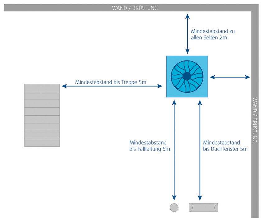 Bei einer Dachaufstellung sind darüber hinaus Mindestabstände zu Treppenaufgängen, Dachfenstern, Dachabläufen und Fallrohren einzuhalten. Zu empfehlen sind fünf Meter. Ist dieser Abstand bei der Anlageninstallation auf Bestandsgebäuden nicht gegeben, sind bauliche Anpassungen erforderlich – beispielsweise ein zu öffnendes Dachfenster mit einem Gassensor und Antrieb auszurüsten, einen Dachabfluss zu verschließen oder ein Fallrohr zu verlegen.