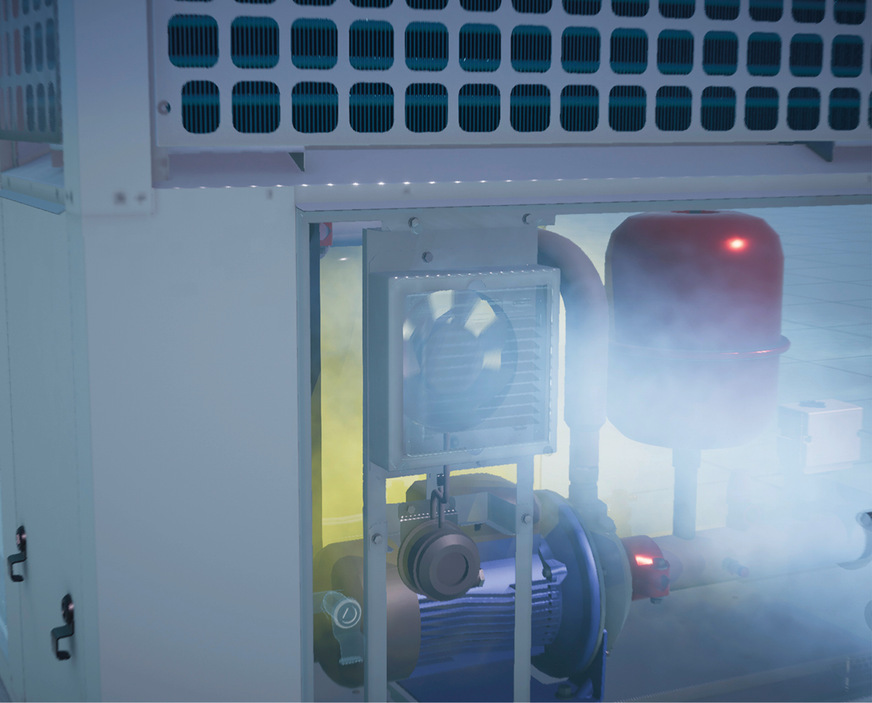 Zum Sicherheitskonzept der Anlage mit dem natürlichen Kältemittel R290 (Propan) gehört der ATEX-zertifizierte Scrollverdichter. Sollte an einer damit ausgestatteten Anlage eine Leckage auftreten, zum Beispiel durch eine Havarie, detektiert ein Gassensor den Austritt mit einer Empfindlichkeit von 20 Prozent LFL 8 g/m³ (LFL = untere Explosionsgrenze). Sobald ein Gasaustritt erkannt wird, stoppt der Anlagenbetrieb. Zeitgleich saugt ein Ex-geschützter Ventilator frische Außenluft an. Der im Anlagengehäuse erzeugte Überdruck spült das Gas an definierter Stelle aus und verdünnt es dabei. Spricht der Gassensor an, wird darüber hinaus ein potenzialfreier Kontakt geschaltet, der einen Alarm in der Gebäudeleittechnik (GLT) auslöst. Mit der Software „AC CLOUD“ können „SYSAQUA BLUE“-Geräte aber auch unabhängig von einer GLT an allen Standorten überwacht und ferngesteuert werden. Das ist einfach umzusetzen und entsprechend kostengünstig.