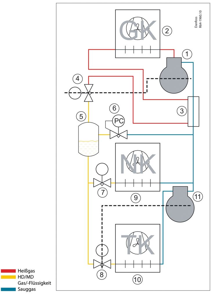 Der Kältemitteldampf wird über ein Bypassventil an die Saugleitung des Hochdruckverdichters geleitet (Bild 1/6). Die Flüssigkeit strömt zu den Expansionsventilen (Bild 1/7 und Bild 1/8), wo sie vor dem Eintritt in die NK- (Bild 1/9) und TK-Verdampfer (Bild 1/10) expandiert.