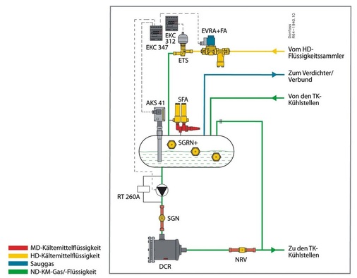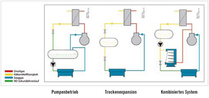 Die Kombination eines Trockenexpansions-Systems mit CO 2 -Pumpenumwälzung wird recht häufig gewählt, um zwei Temperaturniveaus (in der Regel NK- und TK-Kreislauf) zu ermöglichen. Die CO 2 -Pumpe kann zu diesem Zweck zentral eingesetzt werden, um beide Temperaturniveaus mit Flüssigkeit zu beschicken. Die NK-Kühlstellen werden mit flüssigem CO 2 direkt über die Pumpe versorgt. Im Gegensatz dazu arbeiten die TK-Kühlstellen im Trockenexpansionsbetrieb.
