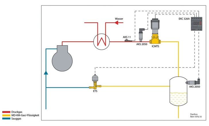 Die Regelung des ICMTS-Drosselorgans kann wie gewohnt über den Gaskühlerregler (EKC 326A) erfolgen, der ebenfalls für diese Anwendung geeignet ist. Der EKC 326A kann zudem das für den Gas-Bypass zuständige ETS-Ventil regeln, während das ICMTS-Ventil in Betrieb ist.