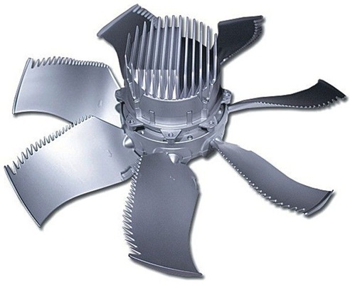 Auch hier ist es in den letzten Jahren gelungen, durch die Entwicklung neuer Aerodynamiken erhebliche Verbesserungen zu erzielen. Die Ziehl-Abegg AG nutzte zur Entwicklung einer neuen Aerodynamik Vorbilder aus der Natur (Bionik): Die Flügelform der Eule wurde auf einen Ventilator übertragen. Das Ergebnis ist eine Flügelgeometrie, die nicht nur außergewöhnlich, sondern auch sehr leise und effektiv ist. Erreicht wurde dies durch die Kombination aus einer gezackten Abströmkante sowie durch ein angebrachtes Winglet (Bild 4).