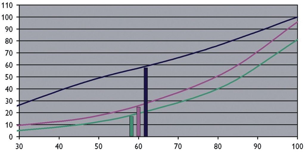 Bild 3 zeigt einen Vergleich der Leistungsaufnahme eines 6-poligen Motors mit einer Anschlussleistung von etwa 2kW. Dem Diagramm kann entnommen werden, dass die Reduzierung der Drehzahl auf 60% der Maximaldrehzahl durch Einsatz eines Spannungsreglers eine Energieersparnis von rund 40% mit sich bringt. Bei Betrieb des gleichen Ventilators an einem Frequenzumrichter Fcontrol sind Energieeinsparungen von bis zu 75% möglich.