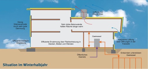 Auch im Winter und in den Übergangszeiten wird das Gebäude sehr umweltschonend und kostengünstig klimatisiert. Der Einsatz einer Wärmepumpe, verbunden mit einer Betonkernaktivierung der Stahlbetondecken, -wände und -böden, ermöglicht das Beheizen des Gebäudes mit konstant niedrigen Vorlauftemperaturen zwischen 20 °C und 30 °C. Die Wärmepumpe deckt an kühlen Tagen die Heizgrundlast, den Rest des Wärmebedarfs bedienen ein konventioneller Erdgas-Brennwert-Kessel und zum kleineren Teil thermische Solarkollektoren.