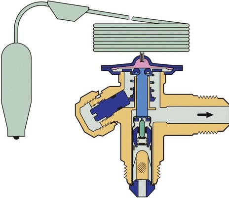 Das thermostatische Expansionsventil besteht aus einem thermostatischen Element mit Fühler, einer Fühlerfüllung, einer Membrane, einer Verbindung mittels Stößel zwischenMembrane und Ventilsitz und einem Gehäuse. Am Expansionsventil steht vom Sammler kommend flüssiges Kältemittel aus der Flüssigkeitsleitung an. Diese Flüssigkeit wird nun durch das Expansionsventil geregelt und über die Einspitzleitung und ggf. einen Kältemittelverteiler in den Verdampfer eingespritzt. Der Fühler wird am Verdampferausgang angebracht und es muss Sorge getragen werden, dass stets der Verdampfungsdruck unter der Membrane im Expansionsventil ansteht.