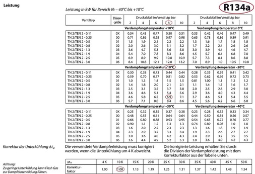 Zuerst muss die Kälteleistung mit dem Korrekturfaktor für die Unterkühlung korrigiert werden, der in der kleinen Tabelle unten abgelesen werden kann (siehe Tabelle Auslegungsbeispiel). Bei 10 K beträgt er 1,08. 7 (kW) dividiert durch 1,08 ergibt 6,5 (kW). Da 10 °C explizit als eigene Tabelle ausgewiesen ist, kann die passende Düsengröße für die Kälteleistung 6,5 kW direkt abgelesen werden. Außerdem wird der Druckabfall über dem Expansionsventil benötigt, da die Verflüssigungstemperatur im Datenblatt nicht direkt angegeben ist.