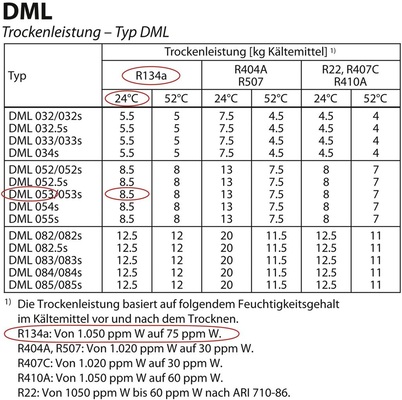 Bei einem Blick auf die entsprechenden Datenblätter begegnet einem wiederholt der Begriff Trockenleistung. Sie gibt die Menge an Kältemittel an, die bei definiertem Kältemittel und festgelegter Temperatur von dem Filtertrockner getrocknet werden kann. Dabei wird ein bestimmter Feuchtigkeitsgehalt des Kältemittels vor und nach dem Trockenvorgang zugrunde gelegt. So kann beispielsweise ein DML 53-Trockner 8,5 kg Kältemittel R 134 a bei 24 °C von 1 050 ppm auf 75 ppm bringen. ppm steht dabei für parts per million, also Teilchen pro einer Mio. Teilchen und bezeichnet im konkreten Fall die Anzahl an Wassermolekülen (H2O), die im Kältemittel pro Million Kältemittelmoleküle vorkommen.