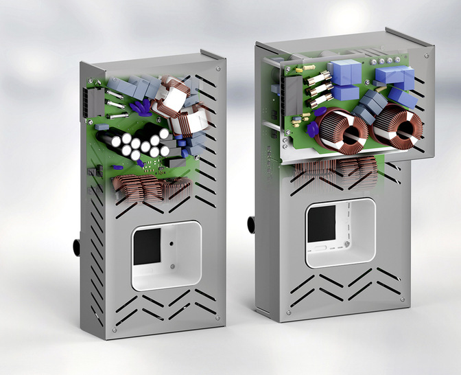 Neben den in Luft-Wasser Wärmepumpen eingesetzten Ventilatoren spielt auch die Geräuschentwicklung und Leistungsaufnahme des drehzahlgeregelten Verdichterantriebs eine wichtige Rolle. Für Luft-Wasser Wärmepumpen bietet ebm-papst EC Radial- und Axialventilatoren für die Innen- und Außenaufstellung an. Aufgrund der Erfahrung mit EC-Motoren, deren Kommutierungselektronik und Wärmepumpenanwendungen wurde jetzt eine Inverter-Elektronik entwickelt, die sich unter anderem für drehzahlgeregelte permanentmagneterregte Synchronmaschinen (PSM) eignet, wie sie typischerweise in Verdichtern z. B. bei Wärmepumpen eingesetzt sind. Hier bietet die neue Elektronik, die es mit Ausgangsleistungen bis 3,5 kW, 7,5 kW und 12 kW gibt, gewisse Vorteile. So reduziert das Kommutierungsverfahren die Geräuschentwicklung; gleichzeitig erhöht sich die Effizienz. Dadurch ließ sich beispielsweise bei einer Wärmepumpe mit einem 7,5-kW-Verdichterantrieb der COP-Wert um 3,5 Prozent steigern.