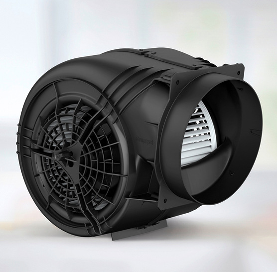 EC-Technologie ist auch in Dunstabzugshauben auf dem Vormarsch. Mit dem RadiFlex hat ebm-papst ein Gebläse entwickelt, das sich in unterschiedliche Haubentypen integrieren lässt. Für den Abluftbetrieb ist das Gebläse optional mit einer Rückschlagklappe erhältlich. Diese verhindert, dass die Abluft zurückströmt oder Außenluft hineinströmt. An der Ansaugseite ist ein Berührschutz integriert. Über die Bajonettverschlüsse am Gehäuse können Aktivkohlefilter für die Geruchsfilterung befestigt werden. Neben dem traditionellen Abluftbetrieb eignet sich der RadiFlex damit auch für den Umluftbetrieb. Pro Stunde kann das doppelflutige Gebläse freiblasend bis zu 930 m³ Luft fördern. Das Gesamtgewicht des liegt bei 1,9 kg.