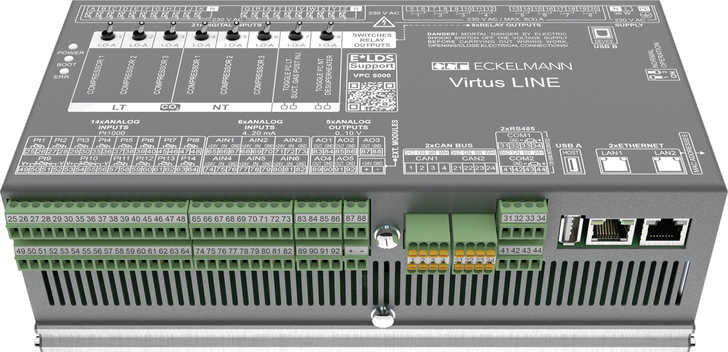 Der Virtus Pack Controller VPC 5000, steuert nativ bis zu 3 TK- und 3 NK-Verdichter. Die netzwerkfähige Komponente integriert hierbei alle Funktionen für den Betrieb transkritischer Booster-Systeme. Hierzu zählen insbesondere die Nieder-, Hoch- und Mitteldruckregelung, Gaskühler, Lüftersteuerung, Kältemittelsammler, sowie die Anbindung von Wärmerückgewinnungssystemen. Das Design (255 x 130 x 100 mm) ohne seitliche Anschlüsse ermöglicht einen lückenlosen Reiheneinbau auf der Hutschiene. Die Bedienung (Anzeige & Parametrierung) erfolgt über die Systemzentrale Virtus 5 bzw. deren Web-Oberfläche im Browser. Alternativ kann die Steuerung über die USB- Service- Schnittstelle bedient und mit Firmware-Updates versorgt werden. Zur Kommunikation mit der Systemzentrale verfügt die Verbundsteuerung über eine Ethernet-Schnittstelle.