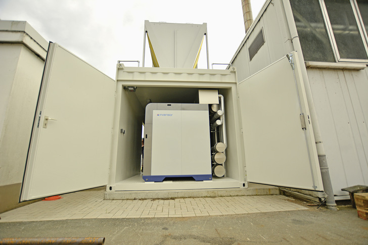 Da der Heizraum zu klein war, um dort sieben Adsorptionskältemaschinen aufzustellen, war die Vorgabe, die gesamte Kältetechnik in einem Container unterzubringen, der außerdem, bedingt durch ein begrenztes Flächenangebot, zwischen zwei Gebäuden platziert wurde. Der Container ist 8,80 Meter lang und drei Meter breit. Darüber hinaus musste er statisch verstärkt konstruiert werden, da auf seinem Dach der Rückkühler zusammen mit einer Wartungsbrücke aufgestellt wurde. Allein das Leergewicht des trockenen Güntner V-SHAPE Vario, Typ GFD, beträgt 2 500 kg. Im Container finden vier InvenSor LTC 30 e plus (LTC = low temperature chiller) und drei InvenSor HTC 18 plus (HTC = high temperature chiller) zur Kühlung der Werkzeuge sowie alle anderen Kältekomponenten Platz.