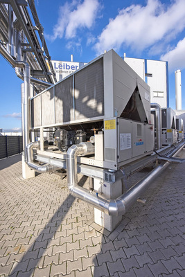 In einer zweiten Ausbaustufe sollen weitere Geräte mit 400 bis 800 kW ergänzt werden. Die beiden Kältekreisläufe der einzelnen Kaltwassersätze sind vollständig voneinander getrennt. So arbeiten die Geräte im Teillastbereich noch effizienter, erzielen eine hohe Betriebssicherheit und punkten auch bei Wartungs- oder Servicearbeiten mit gewohnter Leistung. Die bei der Leiber GmbH verbaute Reihe EWAD-TZ, beansprucht mit ihren kompakten Maßen wenig Raum. Die mögliche Absenkung von Vibrationen und Schallleistungspegel auf bis zu 91 dB(A) sorgt für einen geräuscharmen Betrieb.