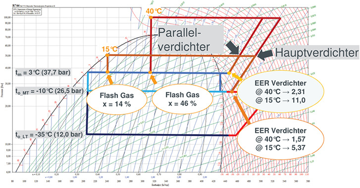 Effizienter ist es, das Flashgas nicht zu entspannen, sondern es sofort zu verdichten und auf Hochdruckniveau (Gaskühler- bzw. Verflüssigerdruck) zu bringen: Augrund des höheren Saugdrucks ist dabei eine geringere Druckdifferenz bis zum Hochdruck zu überwinden, somit ist weniger Antriebsleistung für die Verdichtung erforderlich (Bild 1) . Diese Aufgabe übernehmen Parallelverdichter. Die Effizienzsteigerung ist umso größer, je mehr Flashgas anfällt. Dessen Menge steigt mit höheren Außentemperaturen und/oder bei einer größeren Kältelast. Folgende Vorteile sprechen für die Parallelverdichtung: