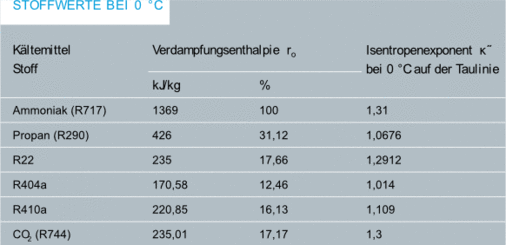 Nach der Tabelle auf dieser Seite brilliert Ammoniak durch eine extrem hohe Verdampfungsenthalpie. Das macht auch den relativ hohen Isentropenexponent κ von 1,31 tolerierbar. Ammoniak wird daher für Großanlagen trotz seiner physiologischen Nachteile ein unverzichtbares Kältemittel bleiben.