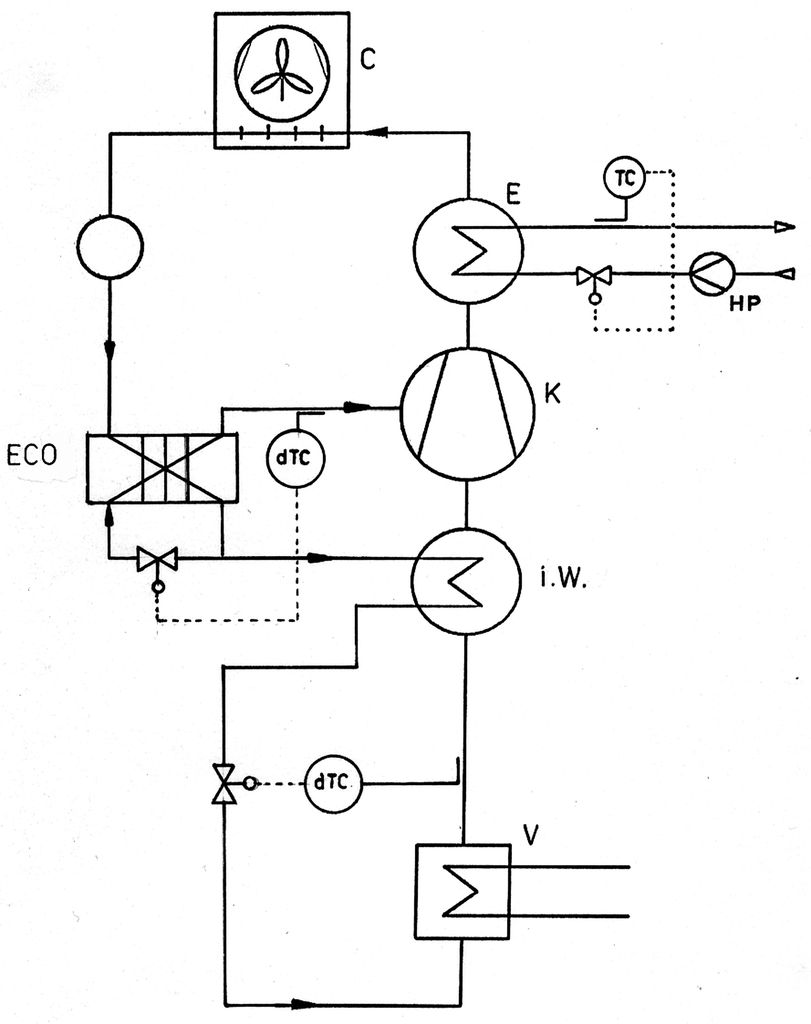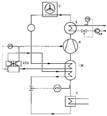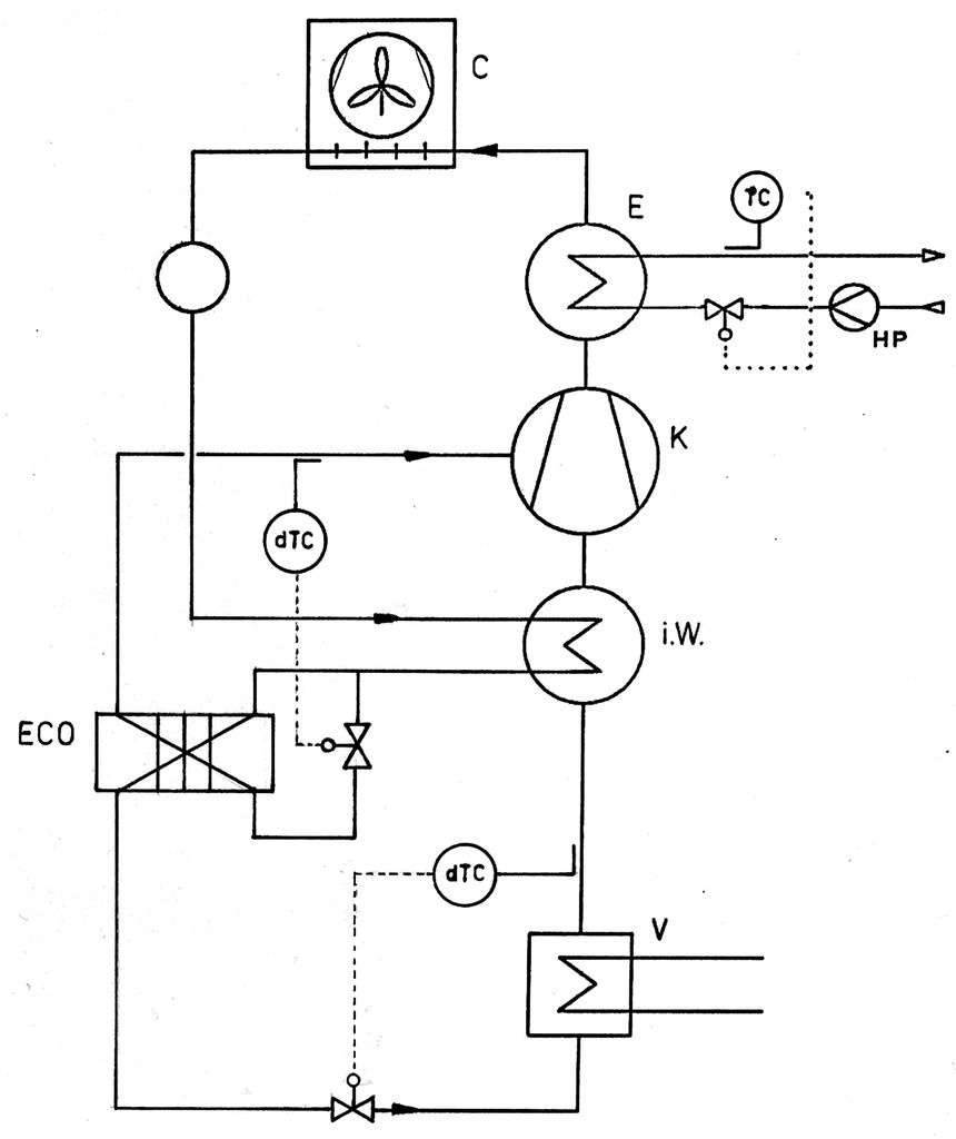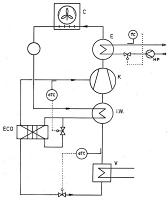 Der Economizer (ECO; Bild 3) unterkühlt das Kältemittel durch Verdampfungskühlung, d.h. ein Teilstrom des Kältemittels wird bei einem Zwischendruck (zwischen Verflüssigung und Verdampfung) in einem Plattenwärmeübertrager durch das warme Kältemittel verdampft. Der verdampfte Teilstrom des Kältemittels wird bei diesem Zwischendruck in den Schraubenverdichter bzw. Scrollverdichter eingeschleust und wieder verdichtet. Diese Methode der Unterkühlung wird praktiziert, ist aber an die Verwendung von Schrauben- oder Scrollverdichter gebunden.