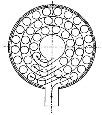Bekannt und bewährt sind Ringkanal-Wärmeübertrager (RKW; Bild 10). Das Gas strömt tangential um ein Zentralrohr in ringförmigen Kanälen. Die hochberippten geraden Rohre werden quer und die Rippen parallel angeblasen. Durch die hohen Rippen lässt sich der Nachteil ungünstiger Wärmeübergangsbedingungen ausgleichen. Die Anströmung der Rippen mit mäßigen Geschwindigkeiten sorgt für extrem geringe Druckverluste. Das ist besonders für innere Wärmeübertrager von großem Wert.