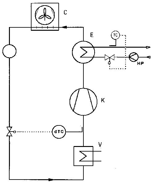 Die Vorschaltung des ECO vor den Sauggaswärmeübertrager (K1) ist dann geboten, wenn das Kältemittel einen Isentropenexponenten κ mit einem Wert >1,2 aufweist. Der Sauggaswärmeübertrager übernimmt dann die zusätzliche Absicherung des Verdichters gegenüber Flüssigkeitsschlägen, begrenzt aber die Sauggastemperatur und damit die Leistungsaufnahme und die Kompressionsendtemperatur des Verdichters. Die Hauptlast bei der Unterkühlung des Kältemittels trägt damit der ECO.
