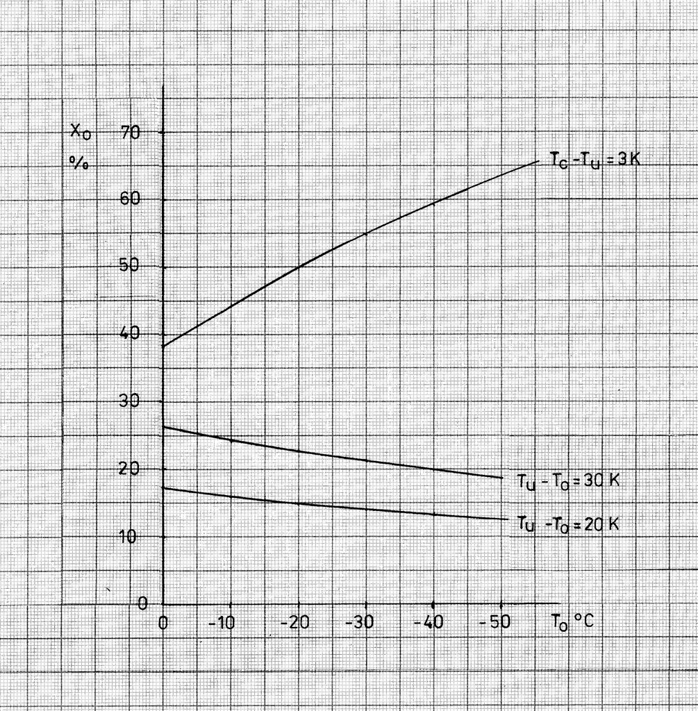 In Bild 2 ist die entstehende Entspannungsdampfmenge x 0 für das Kältemittel R404a über der Verdampfungstemperatur T 0 aufgetragen. Wenn die Unterkühlung des Kondensates im Verflüssiger 3K beträgt, dann ergibt sich die oben gezeichnete Kurve. Bei Tieftemperaturanwendungen kann die Entspannungsdampfmenge ohne zusätzliche Unterkühlung 60% übersteigen.