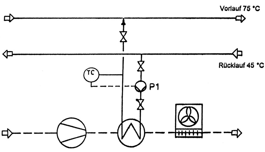Der Investitionskostenaufwand für diese Art der Wärmegewinnung ist denkbar gering, weil in den Gebäuden immer ein Vor- und Rücklauf der Heizwärmeversorgung vorausgesetzt werden darf. Es genügt, einen örtlich vorhandenen Rücklauf anzuzapfen und nach der Wärmegewinnung in den vorhandenen Vorlauf wieder einzuspeisen (Bild 9). Der Enthitzer wurde in den Prozessmodifikationen Bild 1, 3, 4, 5, 6 und 7 optional mit erfasst.