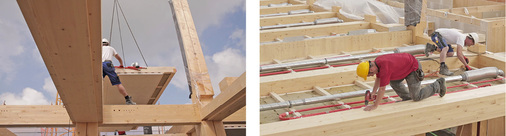 Alle Installationen zur Haustechnik, dementsprechend auch die Lüftungs- und Heiz-/Kühlelemente sind in den im Werk komplett mit TGA-Bauteilen bestückten Deckensegeln in Holzbauweise montiert, die bei der Montage des K8 in die Skelettkonstruktion eingehängt wurden. Auch hier gewährleistet ein hoher Vorfertigungsgrad ein Qualitätsniveau nach industriellen Maßstäben. Die mit Akustikelementen abgedeckten Installationen in den Deckensegeln sind nach der Fertigstellung des Gebäudes leicht zugänglich.