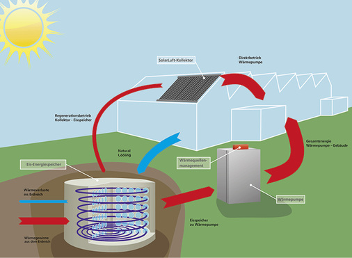 Die dritte Option ist das active cooling (ac). Sie kommt zum Einsatz, wenn das Eis aufgetaut ist. Hierzu wird die Wärme über die Deckenkühlelemente und die Wärmepumpen entweder über die Solar-/Luftabsorber an die Umgebung oder in den Speicher abgeführt. Insgesamt ist die Energiekapazität des Eisspeichers beachtlich: Wird das Wasser von 20 °C auf 0 °C abgekühlt, stehen 16 000 kWh zur Verfügung. Bei einer Vereisung zu 90 Prozent stehen durch den Kristallisationseffekt noch einmal 57 000 kWh zur Verfügung, insgesamt also 73 000 kWh. Dies gilt sowohl für die Heiz- wie die Kühlfunktion des Speichers.