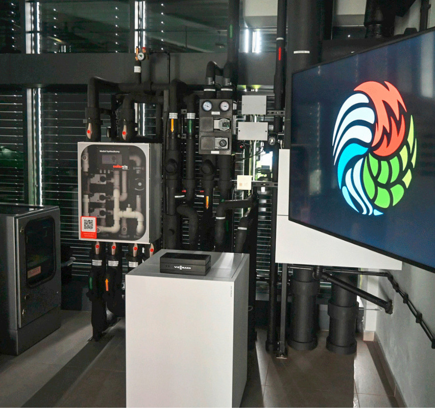Zentraler Bestandteil des Projekts ist ein System mit einer Leistung von 17 kW, welches auf der Basis der Sole-Wärmepumpe Vitocal 200-G arbeitet und damit geeignet ist, bis zu zwei Einfamilienhäuser mit Wärme zu versorgen. Unterstützt wird dieses System dabei von einem Eis-Energiespeicher-System von Viessmann Climate Solutions, welches von der Firma SolarEis Poland installiert und betreut wurde. Dieses Eis-Energiespeicher-System hat einen Durchmesser von drei Metern und ein Volumen von 20.000 Litern, ergänzt wird dieses hierbei durch den Solar-Luftabsorber Hurricane SLA250 L. Die Verwaltung des Systems ermöglicht der Hydraulic Manager HM17 kW, der eine optimale Nutzung der gespeicherten Energie für Heiz- und Kühlzwecke des Gebäudes gewährleistet und zugleich die Effektivität der thermischen Energiespeicherung demonstriert.