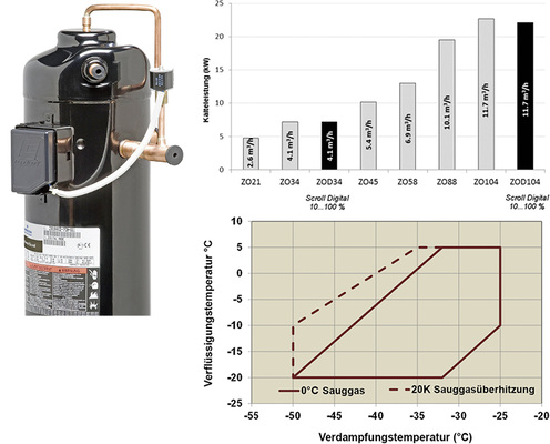 Während die Stream-Verdichtermodelle mit Frequenzumformern in einem Bereich von 25 bis 70 Hz betrieben werden können, er-möglicht sich bei den Scrollverdichtern der ZO-Baureihe der Einsatz der digitalen Leistungsregelung. Die digitale ScrollverdichterTechnologie bietet verschiedene Vorteile, z. B. durch einfache Regelung in einem Regelbereich von 10 bis 100 Prozent der nominalen Kälteleistung. Einsparungen sind hier vor allem möglich, weil keine kostenintensiven Frequenzumformer benötigt werden.
